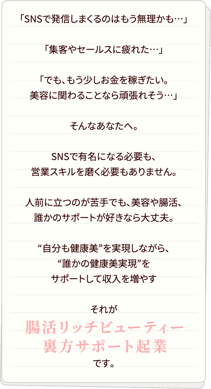 そして、今後はさらに集客の入口を拡大していきます。それに伴い、誰かの綺麗をサポートしたい。という意欲と、美容や腸活を学んだことがあるという方々を大募集しています。